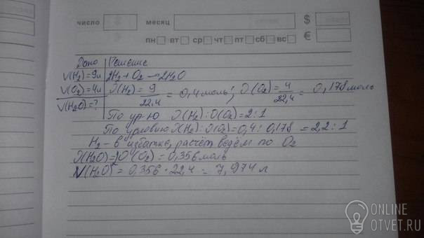 Определите объем образовавшейся воды при зжигании 9 литров водорода с 4 литрами кислорода