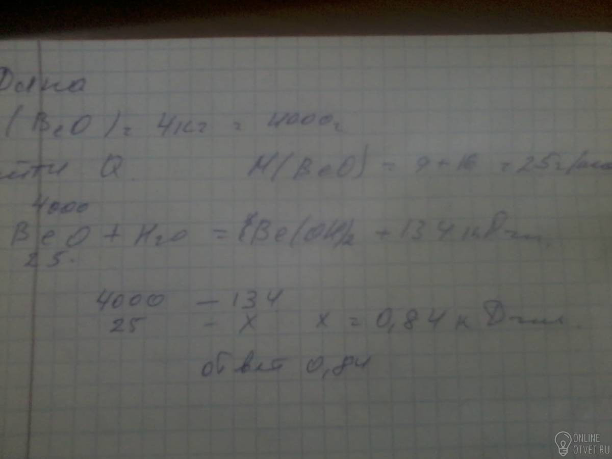 Какое количество энергии получиться при взаимодействии 4 кг оксида бериллия с водой по термическому уравнению реакции ВеО +Н2О= Ве(ОН)2+134 кДж