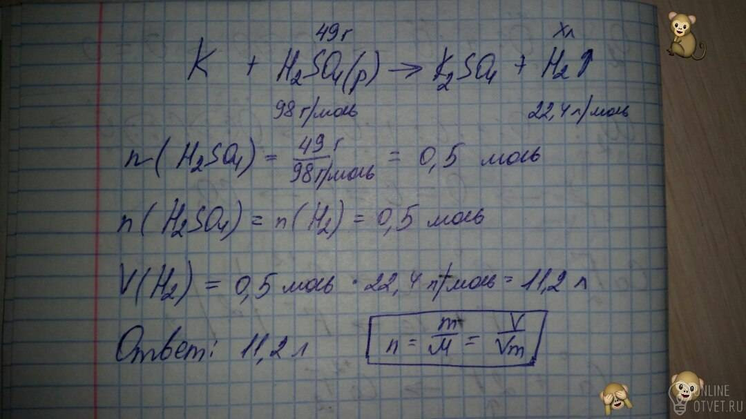 Найти объем водорода который образуется при взаимодействии калия с 49 г серной кислоты?