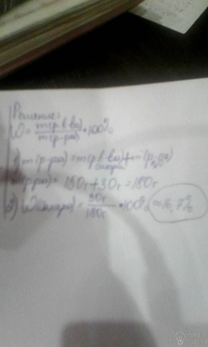 К 150 грамм воды,добавили 30 грамм сахара.Найти масовую долю сахара в полученном растворе.