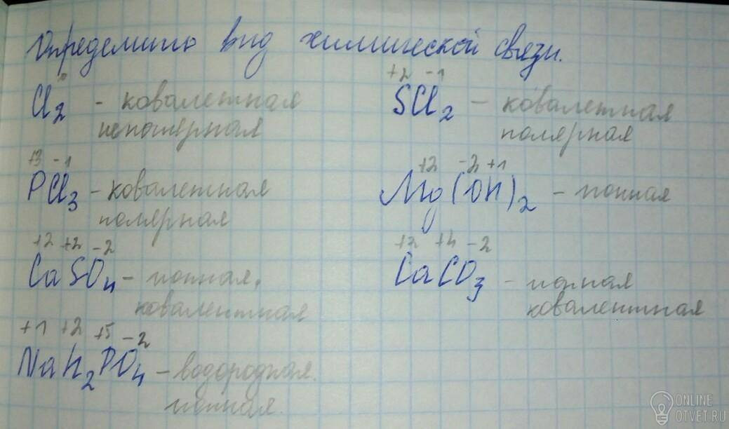 В NaH2PO4 - ионная (Na-O) и ковалентная полярная P-O). Mg(OH)2 - ионная (Mg-O) и ковалентная полярная (O-H). CaSO4 и CaCO3 ионная и ковалентная полярная. Остальное верно