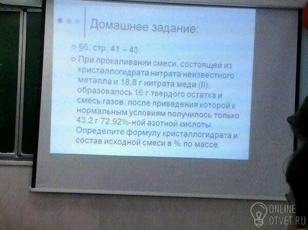 1) находим количество вещества нитрата меди(II), оксида меди(II) и оксида азота(IV) n(Cu(NO₃)₂) = 18,8/188 = 0,1 моль. 2Cu(NO₃)₂ = 2CuO + 4NO₂ + O₂ n(CuO) =n(Cu(NO₃)₂) = 0,1 моль. m(CuO) =0,1 * 80 = 8 г n(NO₂) =2n(Cu(NO₃)₂) =0,2 моль. 2) Определяем состав раствора кислоты m(HNO₃) = 43,2 * 0,7292 = 31,5 г n(HNO₃) = 31,5 /63 = 0,5 моль. m(H₂O) = 43,2 - 31,5 = 11,7 г. n(H₂O) = 11,7 / 18 = 0,65 моль. 3) Определяем количество вещества кристаллизационной воды: 4NO₂ + O₂ + 2H₂O = 4 HNO₃. n(H₂O) пререагировало = 0,5n(NO₂) = 0,1 моль. n(H₂O) всего = 0,65 + 0,1 = 0,75 моль. 4) Определяем состав неизвестного кристаллогидрата при его разложении выделилось 0,5 - 0.2 = 0,3 моль NO₂. раз получилась только азотная кислота, то разложение неизвестного нитрата проходило тоже с выделением NO₂. оксида осталось 16-8= 8 г Если металл двухвалентный , то количество вещества нитрата и оксида = 0,5 n(NO₂). 2Мет(NO₃)₂ = 2МетO + 4NO₂ + O₂ М(оксида) = 8/0,15 = 53,(3) - такого оксида металла нет. Если металл трехвалентный, то 4Мет(NO₃)₃ = 2Мет₂O₃ + 12NO₂ + 3O₂. количество вещества оксида = 1/6 n(NO₂). = 0,05 моль. М(оксида) = 8/0,05 = 160 - это оксид железа(III). n(Fe(NO₃)₃) = 0,1 моль, тогда на 1 моль этого нитрата приходится 7,5 моль воды (возможно это смесь кристаллогидратов *6H₂O и *9H₂O). m(Fe(NO₃)₃ *7,5H₂O) = (242 + 7,5* 18)*0,1 = 37,7 г. m(Cu(NO₃)₂) = 188 * 0,1 = 18,8 г. m смеси = 37,7 + 18,8 = 56,5 г. w(Cu(NO₃)₂) =18,8 / 56,5 = 0,33, или 33%