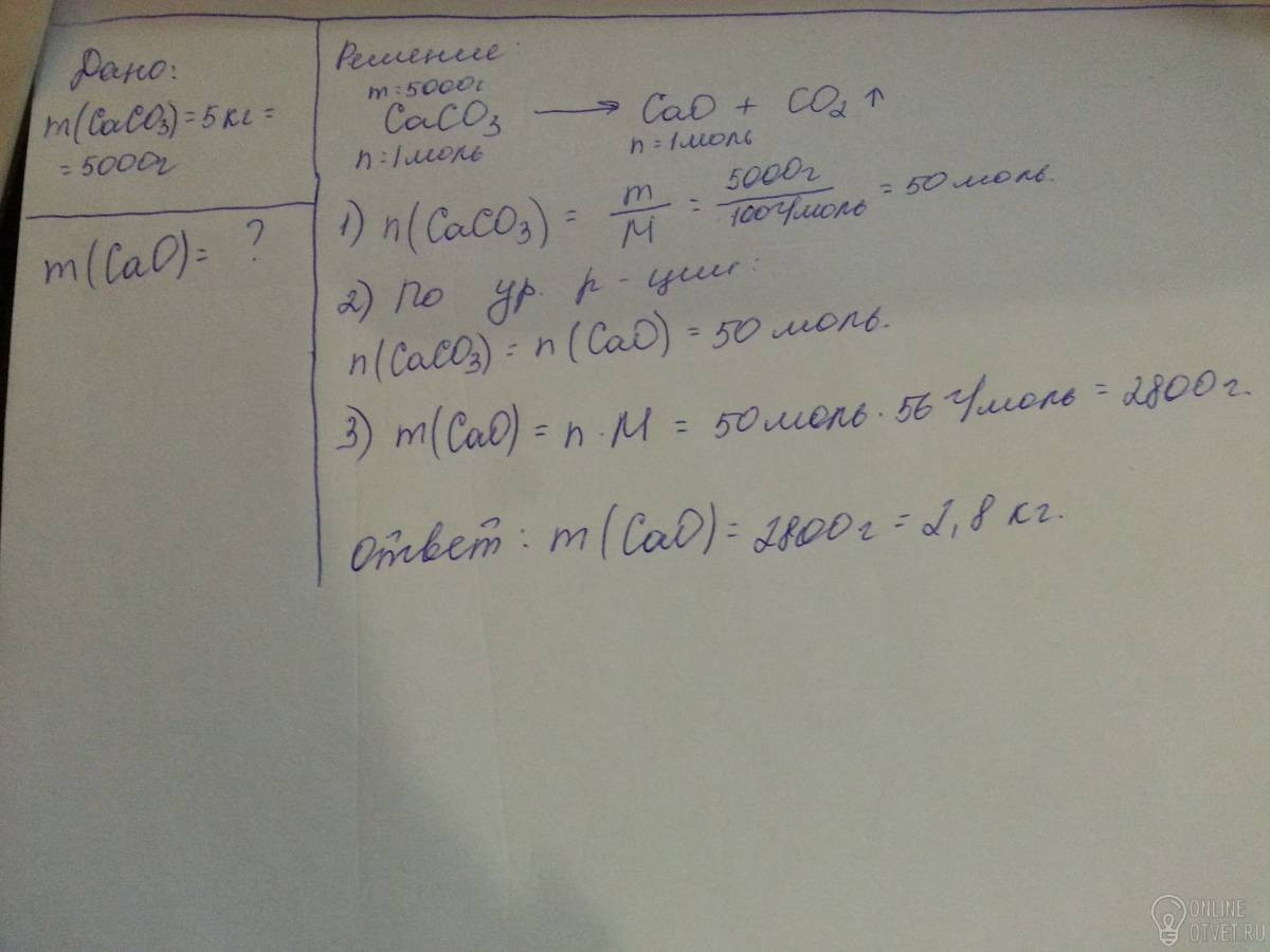 Определите массу негашеной извести, полученной при прокаливании известняка, содержащего 5 кг карбоната кальция.Подробное решение,по действиям