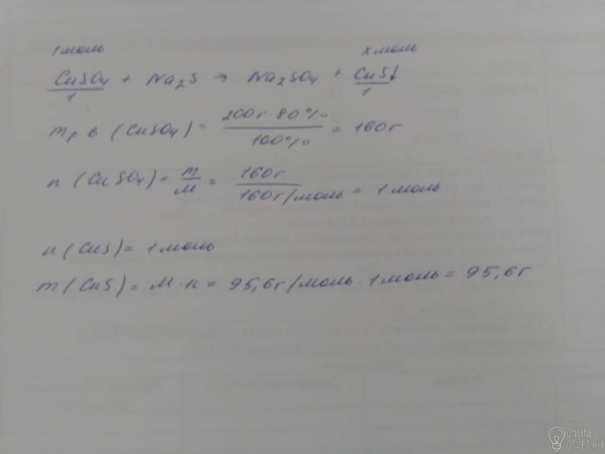 Вычислите массу султфида меди (||), образующегося при взаимодействии раствора сульфата меди (||) массой 200 г и массовой долей растворённого вещества 80% с раствором сульфида натрия