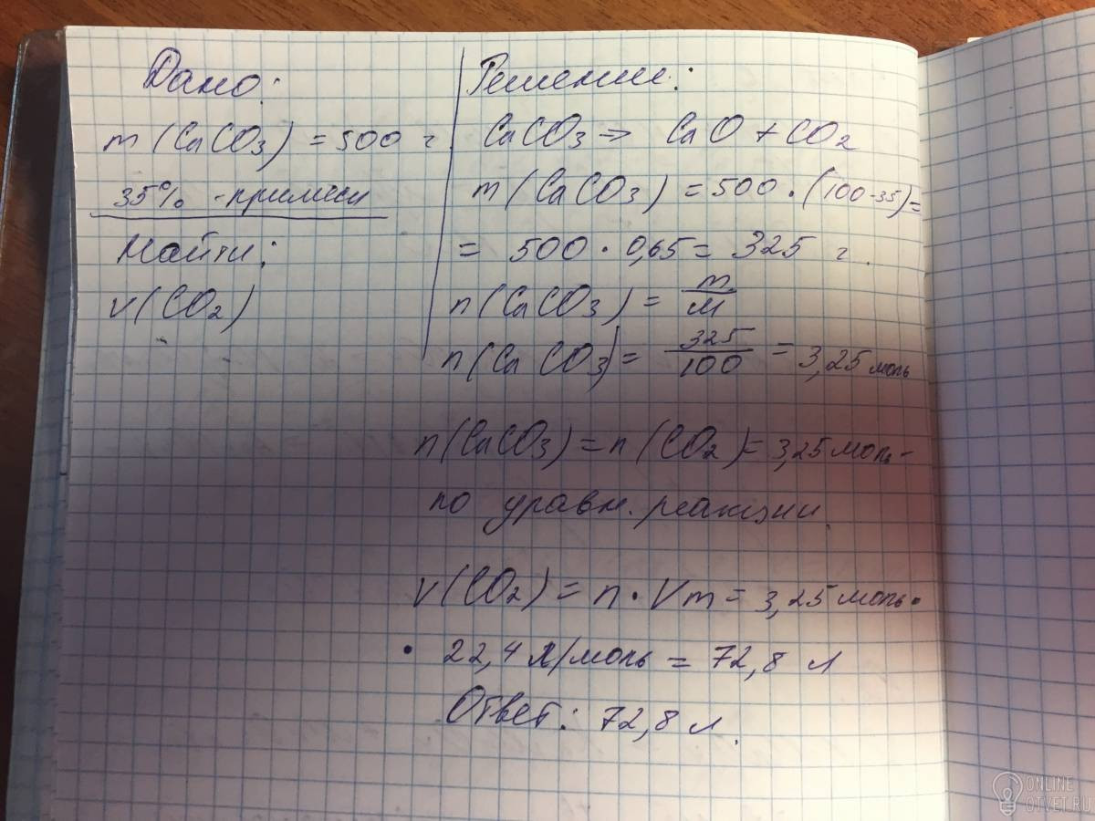Сколько литров углекислого газа образуется при разложении 500 г карбоната кальция содержащего 35% примисей