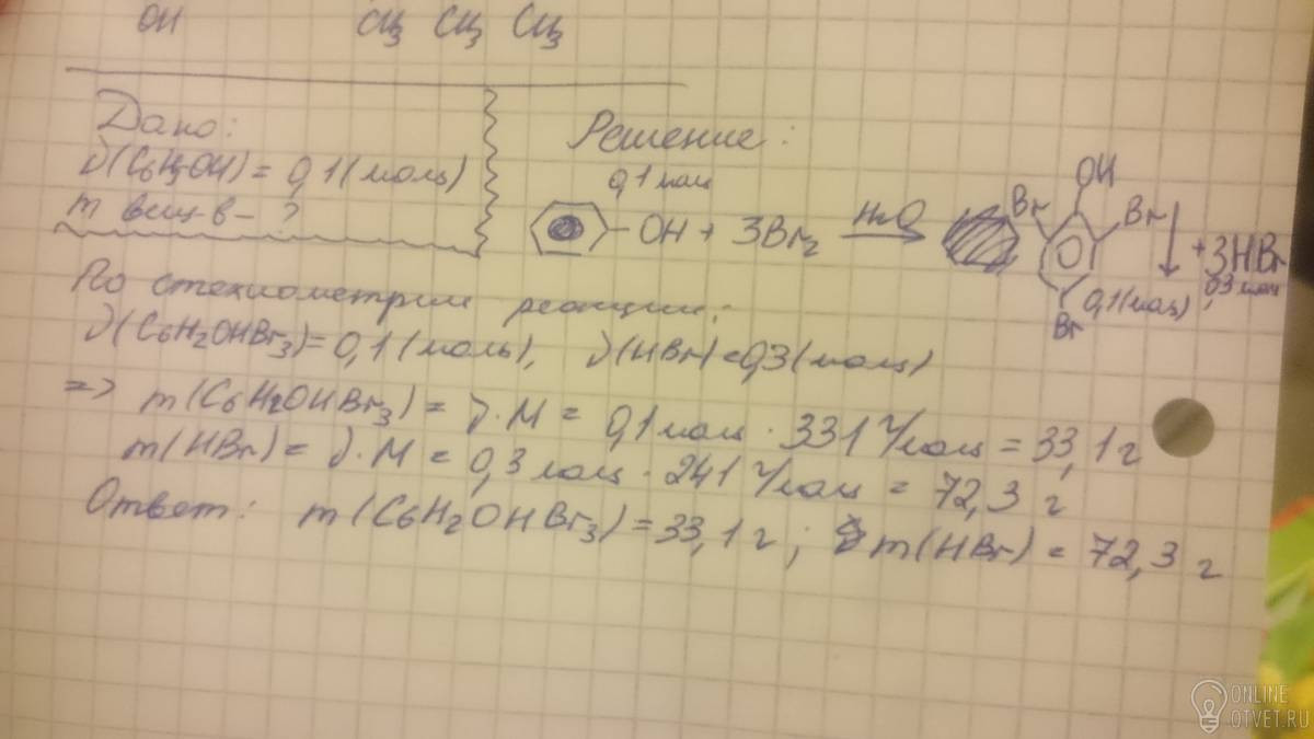 На раствор, содержащий 0,1 моль фенола, подействовали бромной водой, взятой в избытке. Какие вещества и сколько граммов их образовалось?