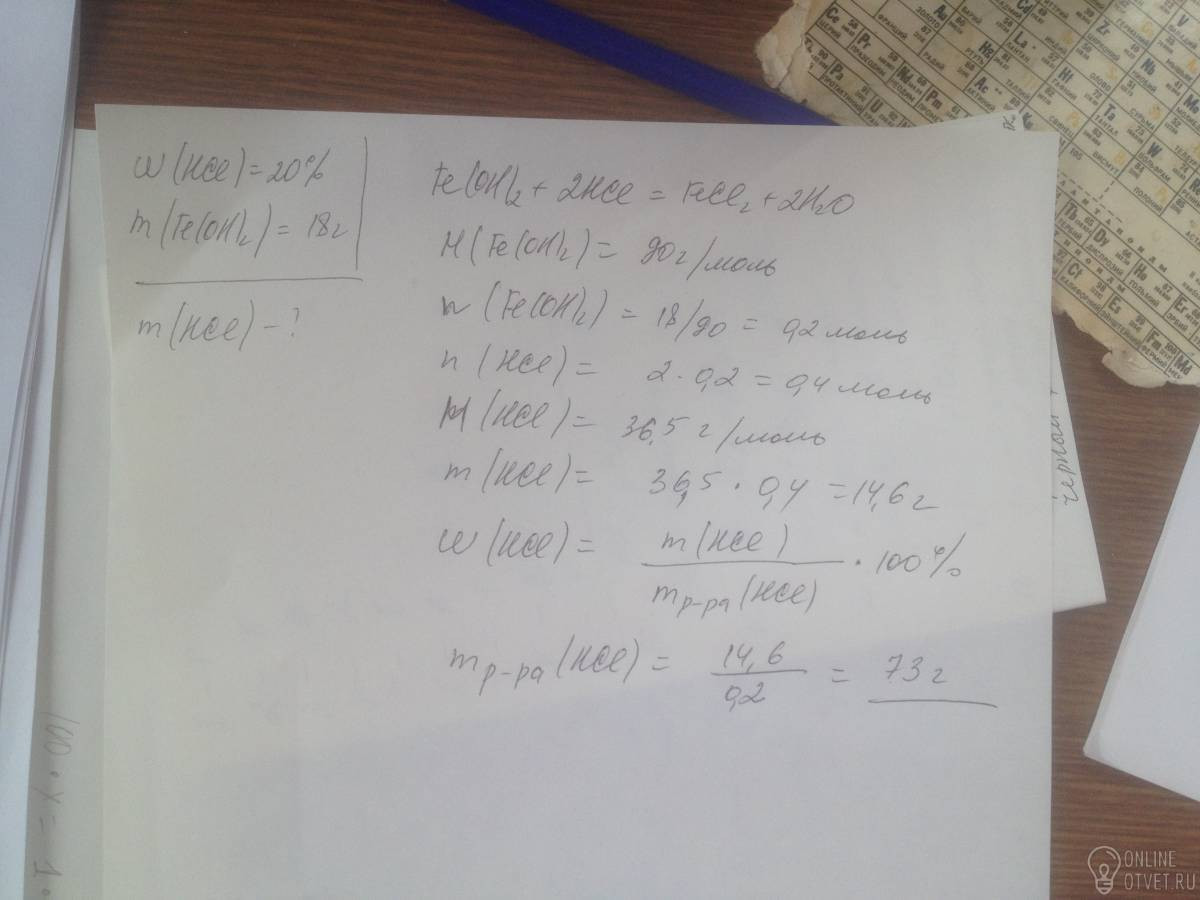 Вычислите массу 20%-ного раствора соляной кислоты,который потребуется для полного растворения 18г гидроксид железа(2)
