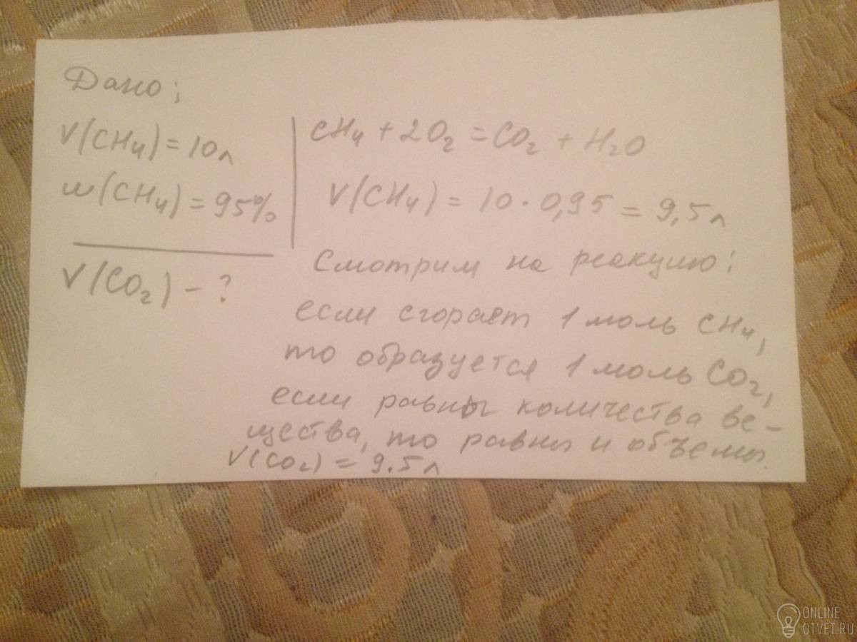 Добрый вечер! Хочу задать вопрос по химии. Задача не сложная, но никак не могу догадаться, как правильно её решить! Какой объём газа выделится при сгорании 10 литров газа, содержащего 95 % CH4. Огромное спасибо!
