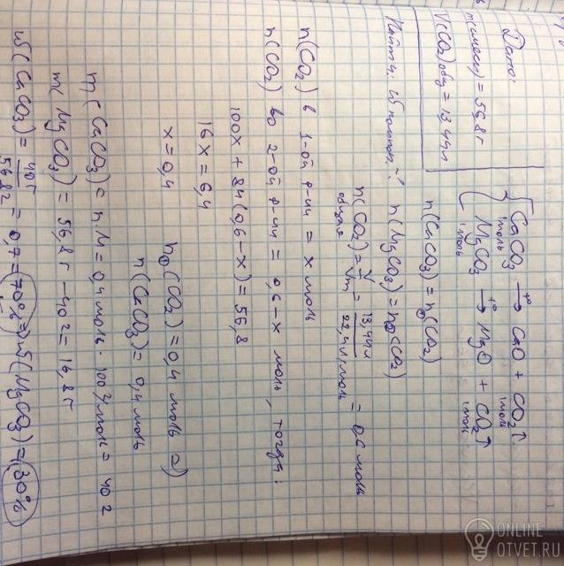 1. При разложении 56.8 г смеси карбонатов кальция и магния выделилось 13,44 л углекислого газа (н.у.). Определите массовые доли (%) компонентов смеси.