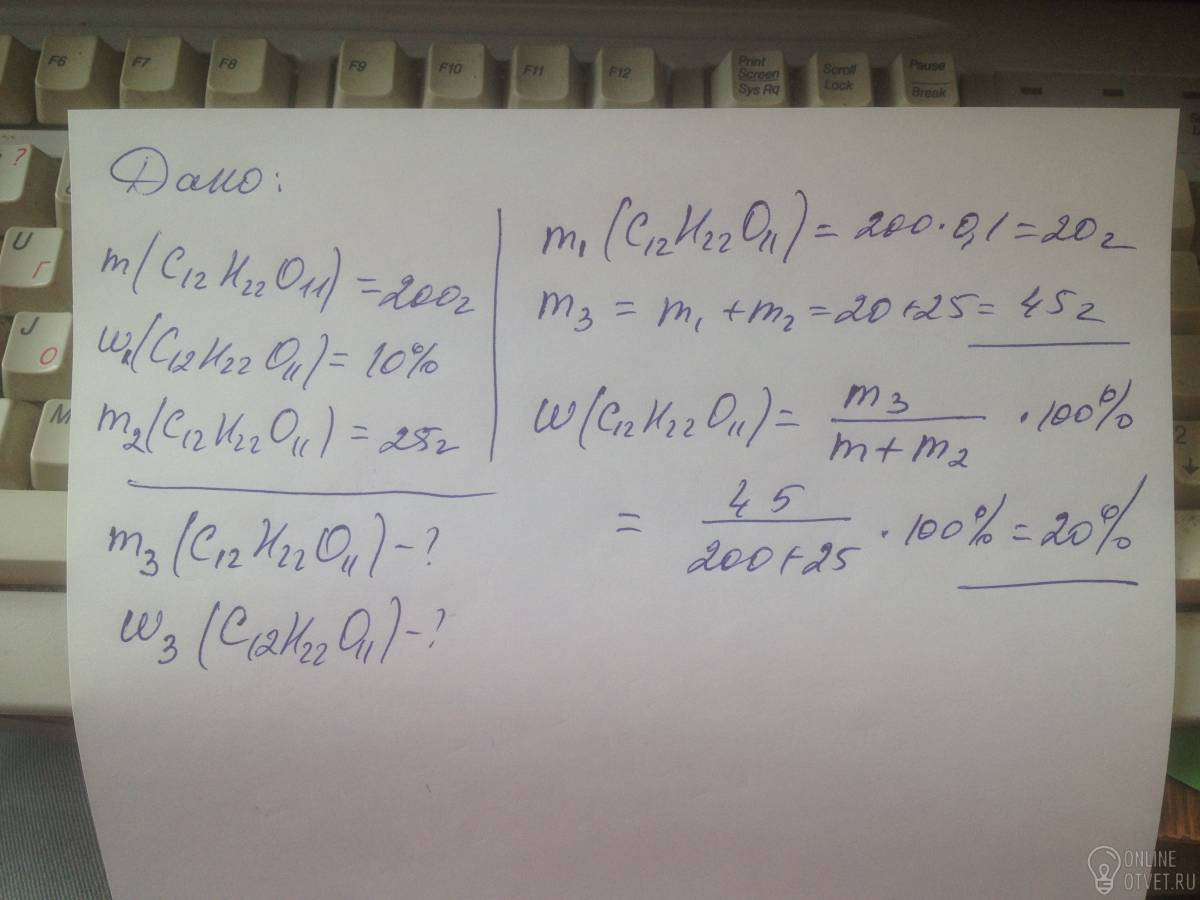 К 200 г 10%-ного раствора сахарозы добавили 25 г сахарозы. Рассчитайте массу сахарозы в полученном растворе и её процентную концентрацию. Запишите подробное решение задачи