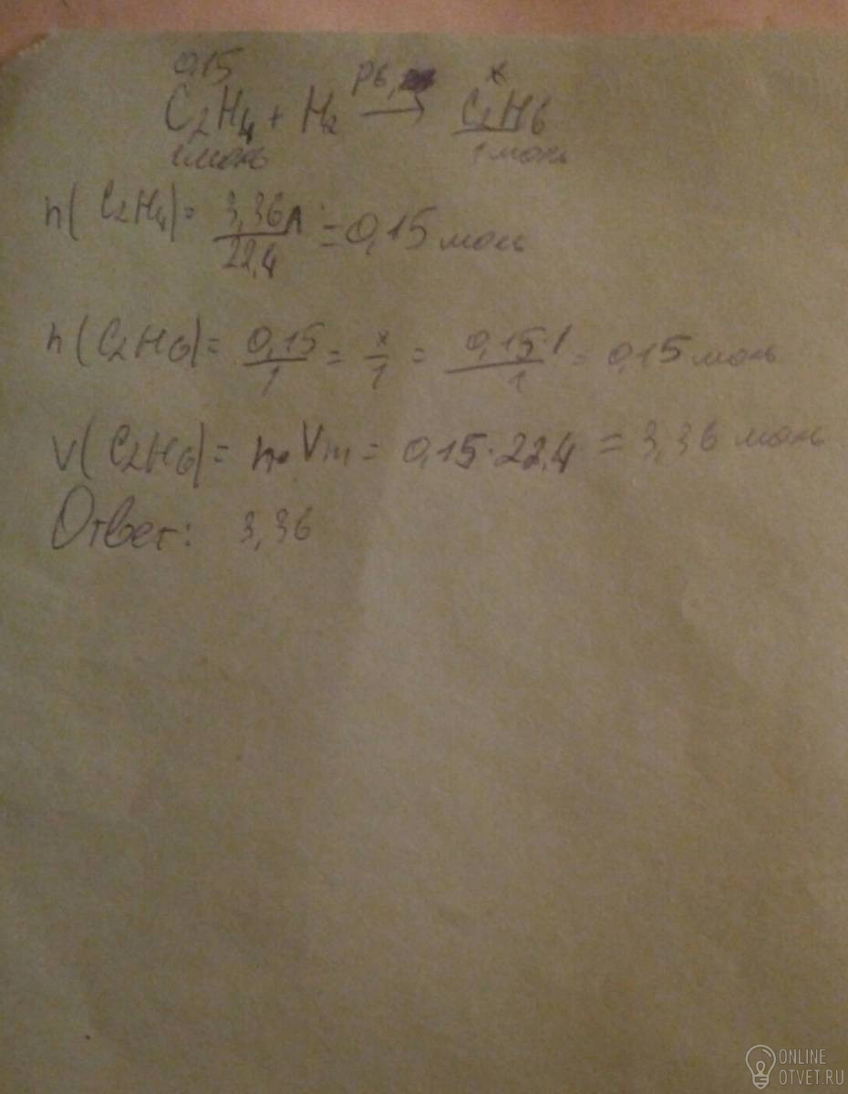 Определите объем этана, образовавшегося при взаимодействии 3,36л этилена (н.у) с водородом?