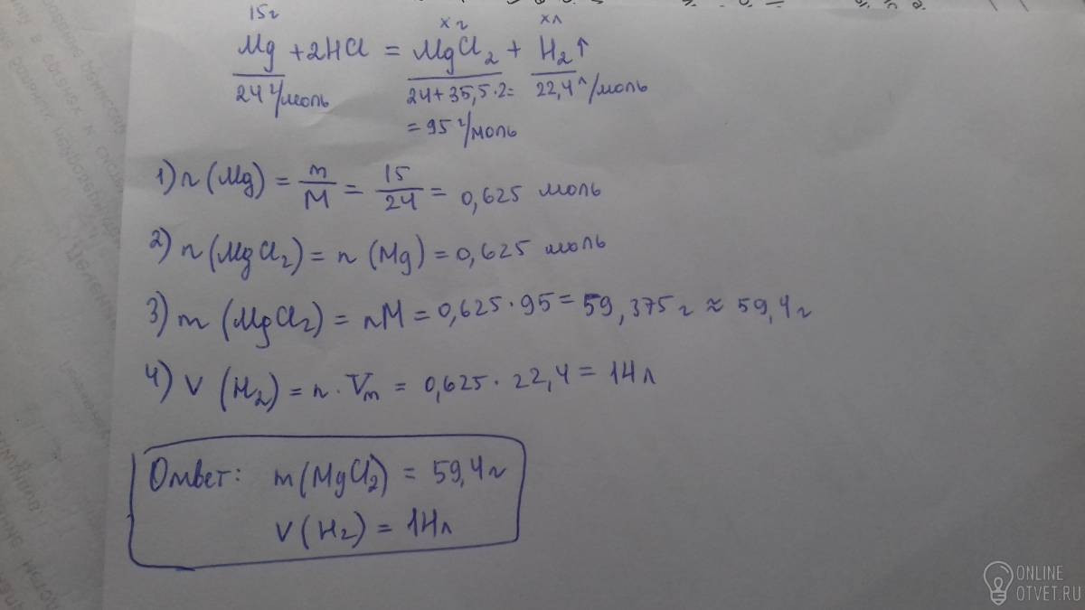 При взаимодействии 15 г магния с соляной кислотой образовалась соль и водород. Определите количество вещества образовавшейся соли и объем выделившегося водорода