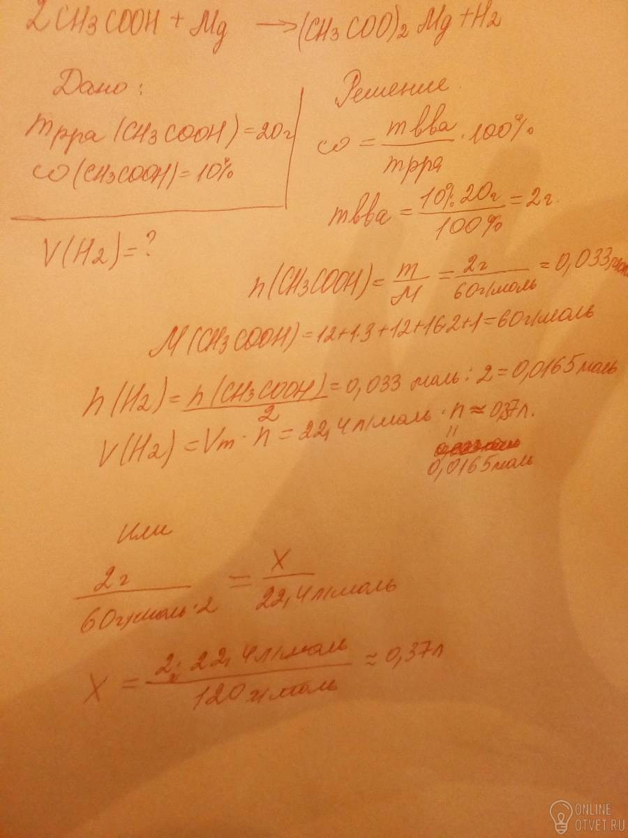 Какой объем водорода (н.у.) выделится при действии магния на раствор уксусной кислоты массой 20 г и массовой долей 10%
