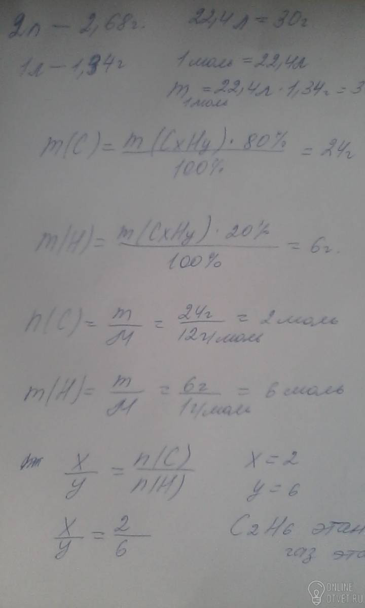 Определить молекулярную формулу газа, если он состоит из 80% углерода и 20% водорода, а масса 2 литров этого газа равна 2,68 грамм