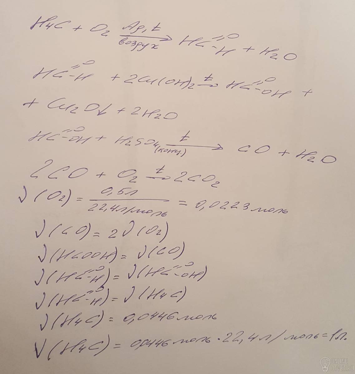 Формальдегид, полученный окислением метана, окислили до муравьиной кислоты, которую, затем, смешали с концентрированной серной кислотой и нагрели. После этого полученный газ сожгли, затратив при этом 500 мл кислорода (н.у.). Найдите объем исходного метана (н.у.) (ответ: 1л)