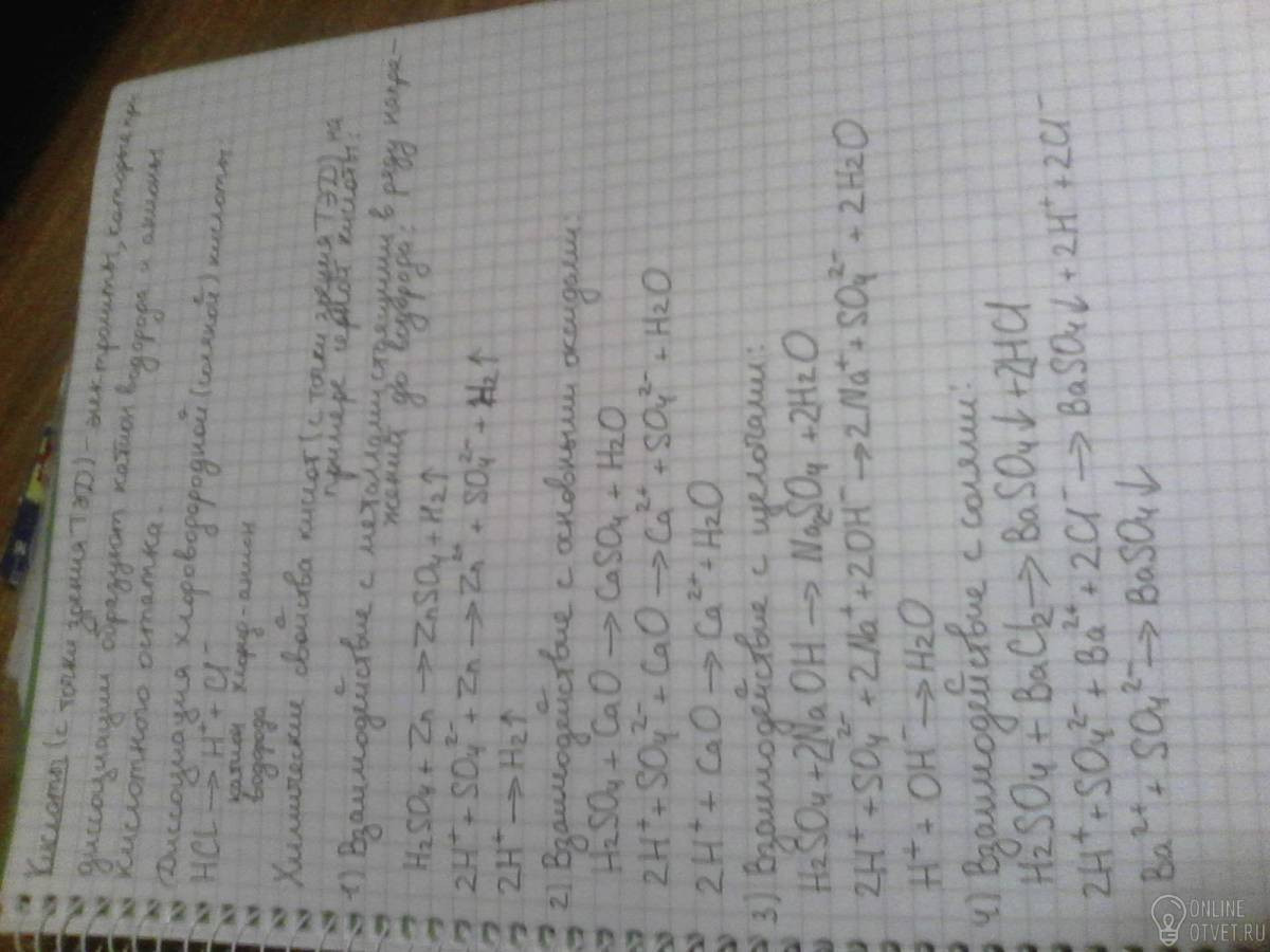 Кислоты с точки зрения ТЭД. Определение кислот с точки зрения ТЭД. Реакция диссоциации на примере хлороводородной кислоты. Химические свойства с точки зрения ТЭД на примере серной кислоты ( взаимодействие с цинком, оксидом кальция, гидроксидом натрия, хлоридом бария). Написать уравнения реакций в молекулярной и ионно-молекулярной формах.