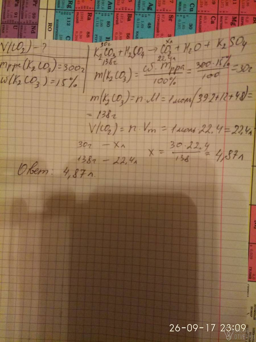 Рассчитайте объем углекислого газа(при н.у),если он выделилсчя при взаимодействии 300 г раствора карбоната калия с массовой долей последнего 15% с серной кислотой