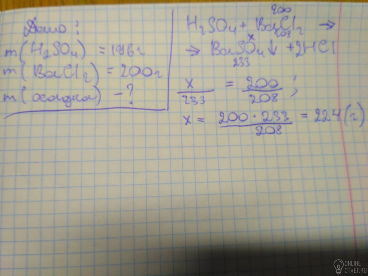 Решите задачу. Какая масса осадка образуется при сливании 196 г серной кислоты с 200 г хлорида бария.