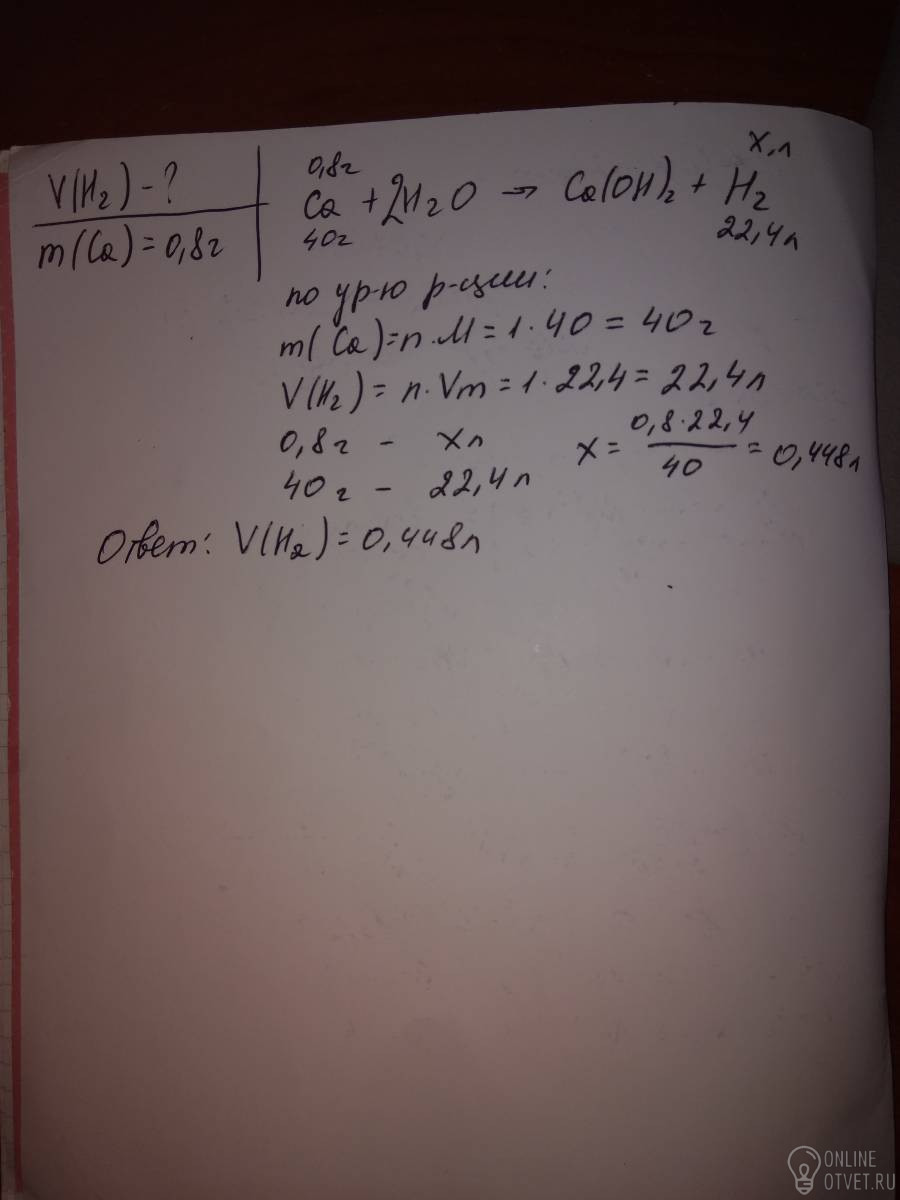 Найти обьем водорода выделившегося при взаимодействии 0.8г кальция с водой