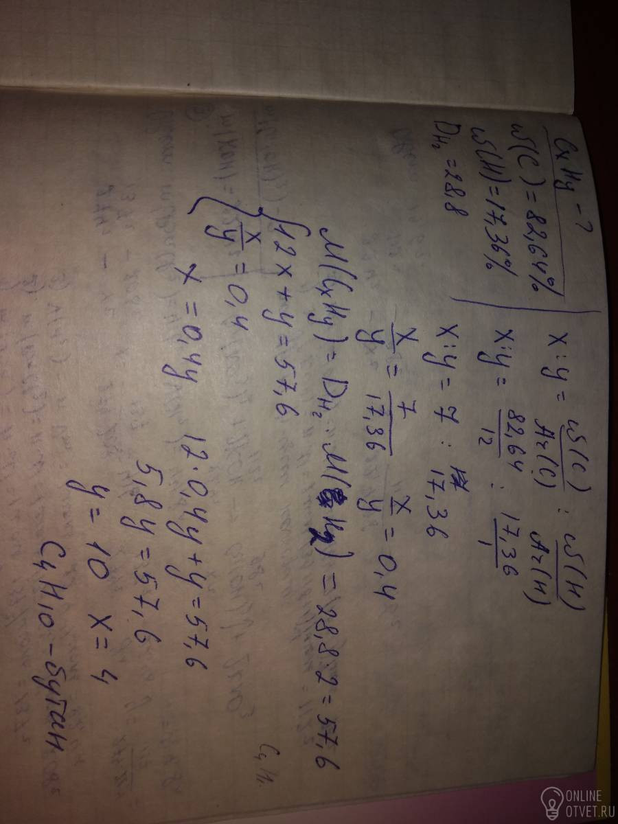 Найти молекулярную формулу вещества содержащего 82, 64% углерода и 17,36% водорода плотность по водороду 28,8%
