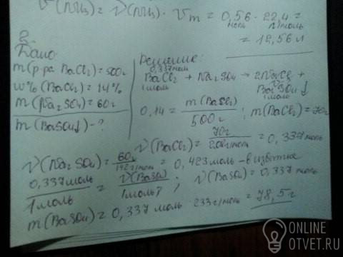 2. К раствору хлорида бария массой 500г и массовой долей вещества 14% добавили 60г сульфата натрия. Определите массу выпавшего осадка.