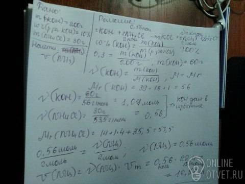 1. Вычислите объем выделившегося газа при взаимодействии 200г 10% раствора гидроксида калия и 30 г хлорида аммоний.