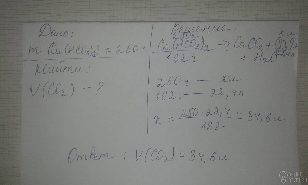 Какой объем выделится при разложение 250гр гидрокарбоната кальция .