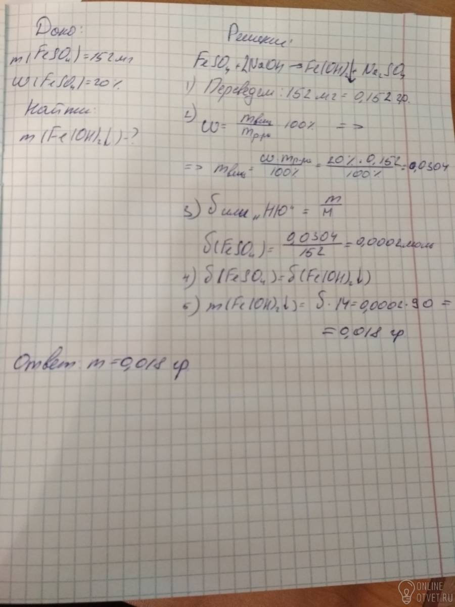 Сколько граммов осадка образуется при взаимодействии 152мг 20%-ного раствора сульфата железа (+2) с необходимым количеством гидроксида натрия.Подскажите пожалуйста