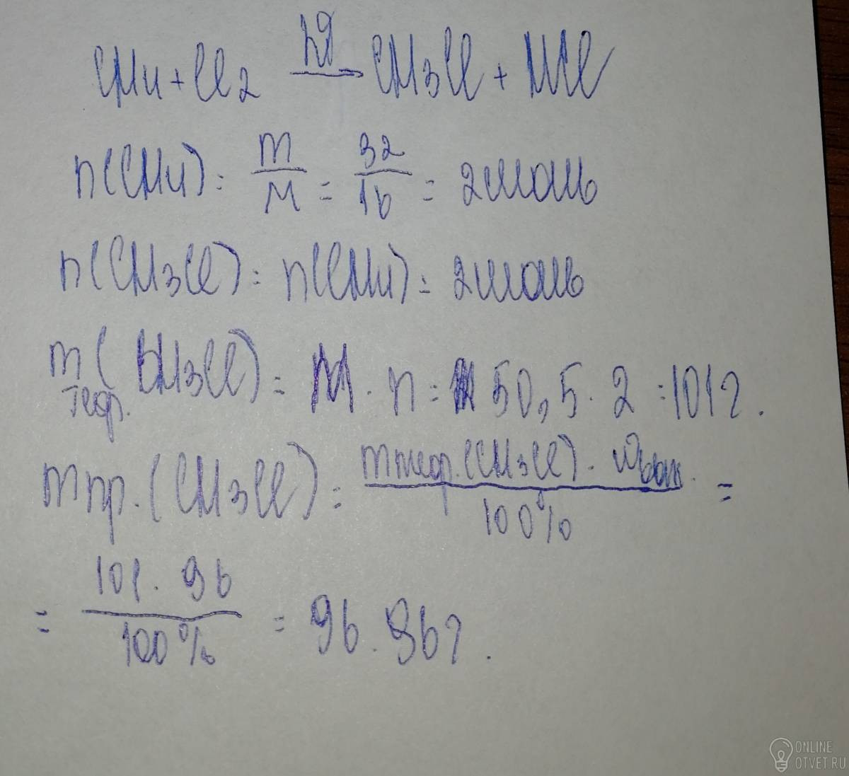 В реакцию с хлором вступило 32гр метана. вычислить массу хлорэтана если его выход составляет 96%