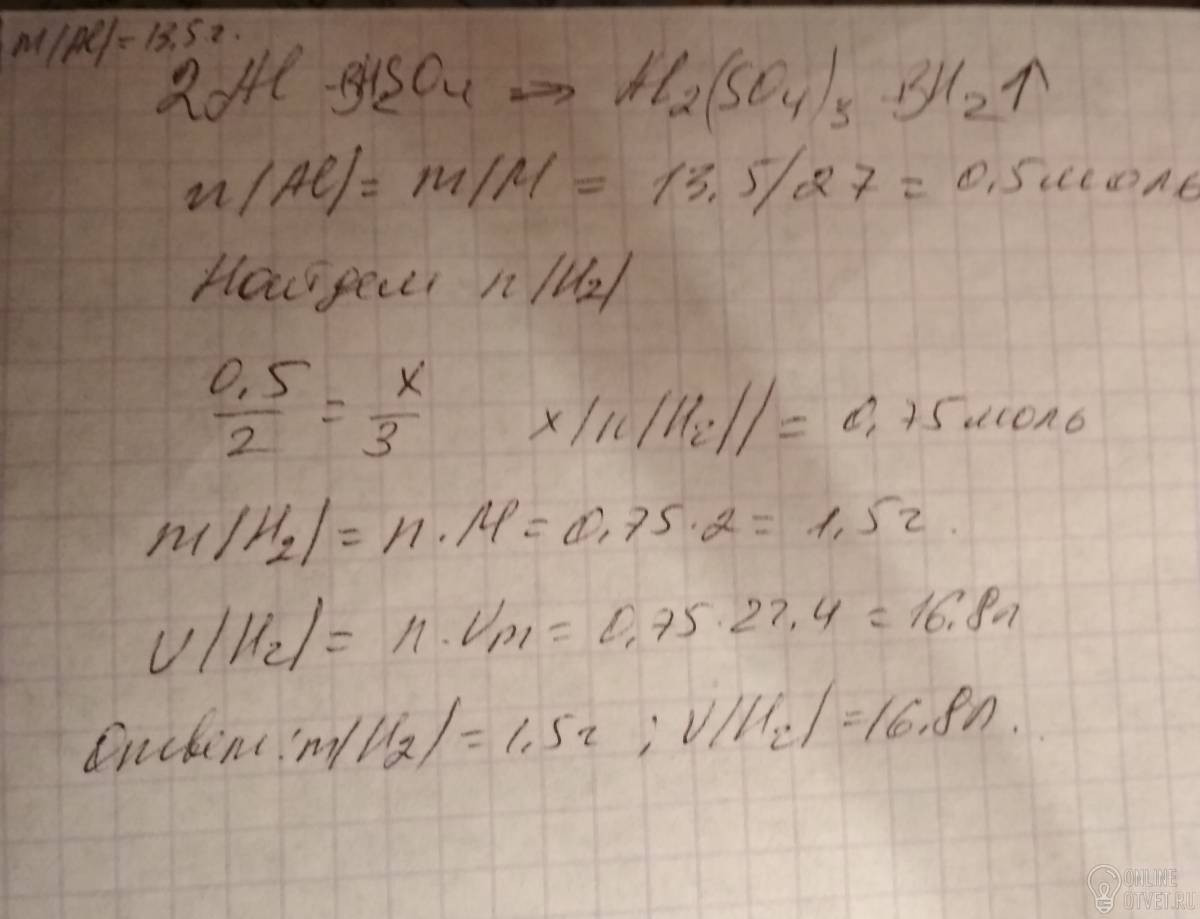 Какая масса газа и какой обьем этого газа (н.у) выделится при взаимодействии 13,5 грамм алюминия с серной кислотой