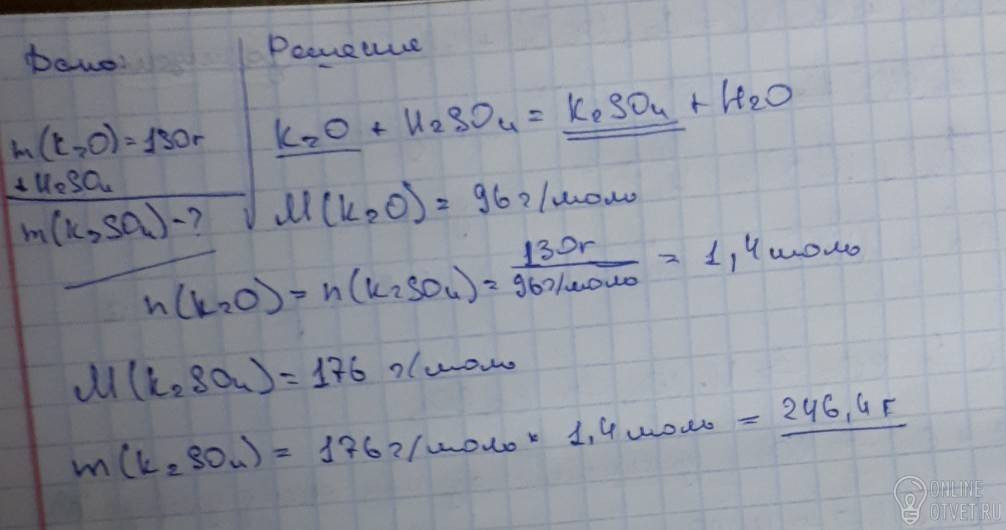Определите массу сульфата калия которое получили при растворении 130 г оксида калия в серной кислоте