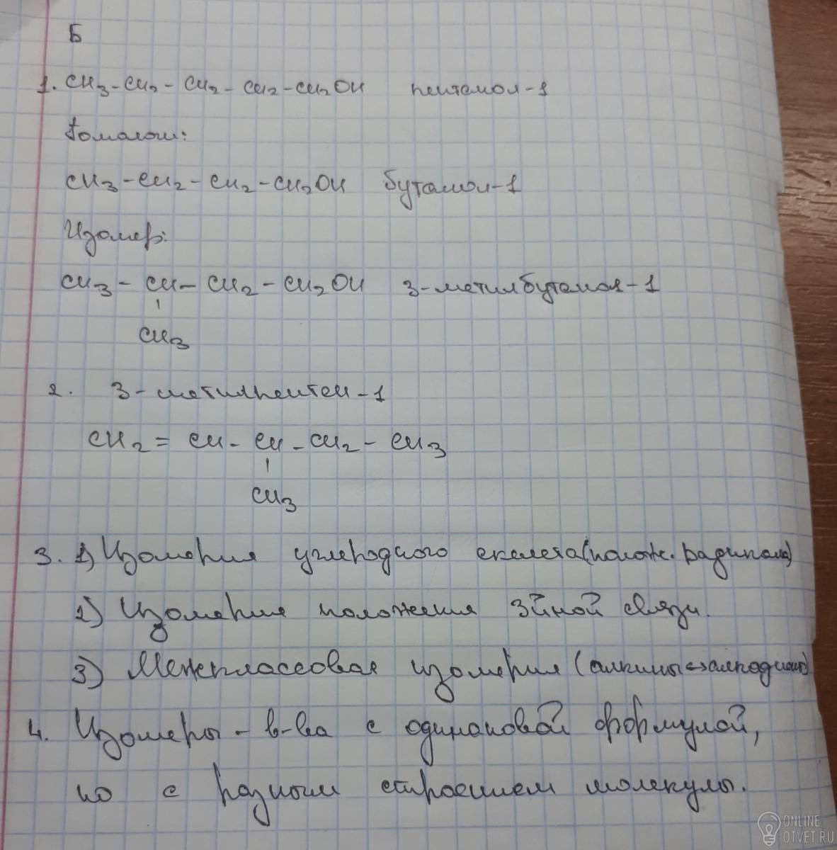 ЧАСТЬ Б. Задания со свободным ответом (10 баллов). Для вещества формула которого СН3 – СН2 – СН2 – СН2 – СН2ОН, составьте структурные формулы одного гомолога и одного изомера. Назовите все вещества. (4 балла). Составьте структурную формулу 3-метилпентена-1. (6 баллов). Перечислите виды изомерии, характерные для алкинов. (2 балла). Допишите фразу: «Изомеры – это вещества …».