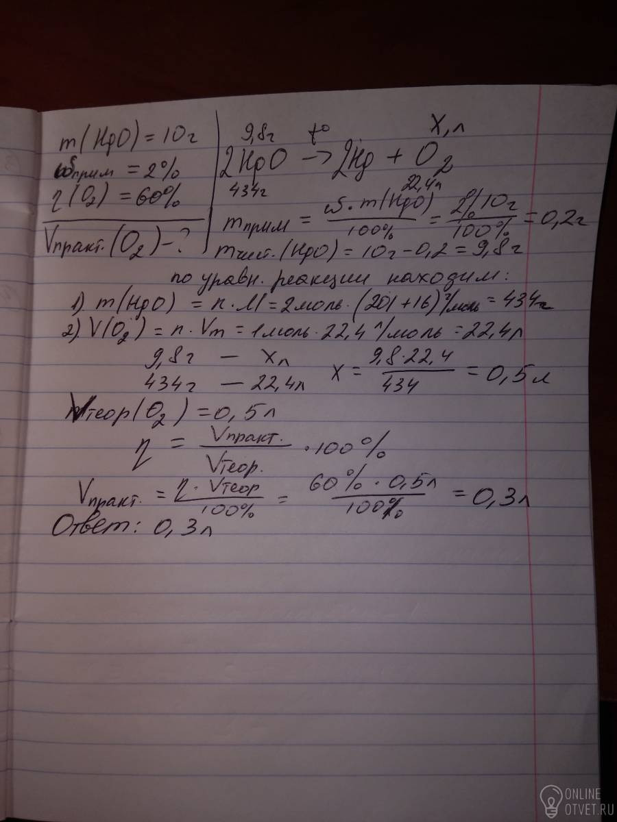 При разложении оксида ртути массой 10г. Содержащего 2% примесей. Вычислить объём кислорода, если выход продукта составил 60%