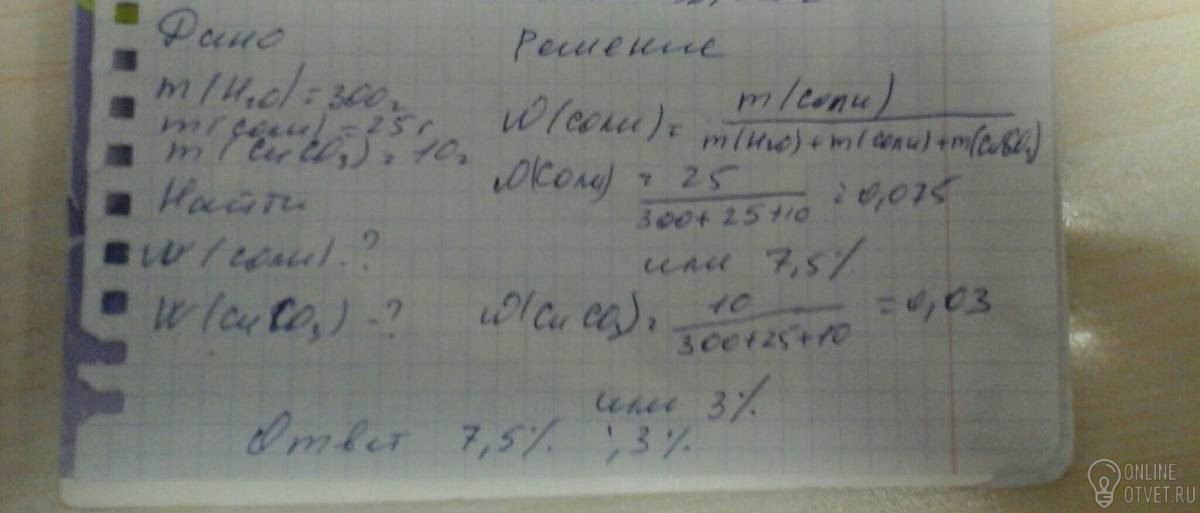 В 300г воды растворили 25г соли и 10г карбоната меди найти массовую долю соли и массовую долю карбоната меди