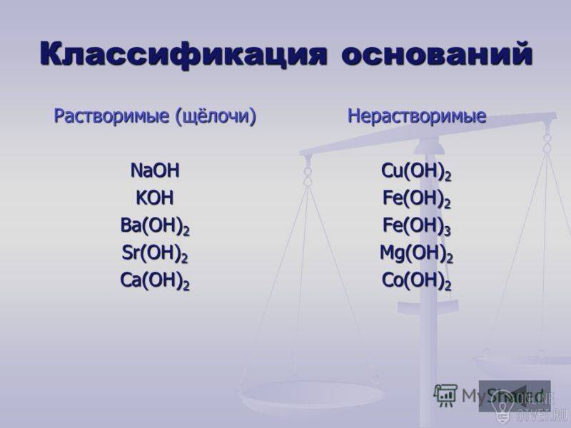 Записать формулы и названия 5 щелочей и 5 нерастворимых оснований,срочно пожалуйста