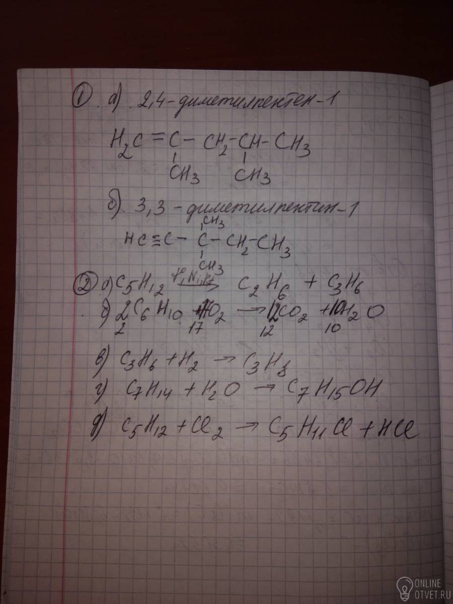 Помогите пожалуйста. 1. Напишите структурные формулы а) 2,4 Диметилпентен-1 б) 3,3 диметилпентин-1. 2.допишите уравнения реакции а)пентае---крекинг б) гексин+O2--- в)C3H6+H2--- г)C7H14+H2O-- д) C5H12+CI2--