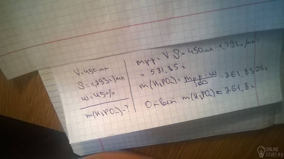 Определите массу ортофосфорной кислоты H3po4, которая содержится в 450 мл раствора с массовой долей 45%.Плотность раствора равна 1,293 г/мл