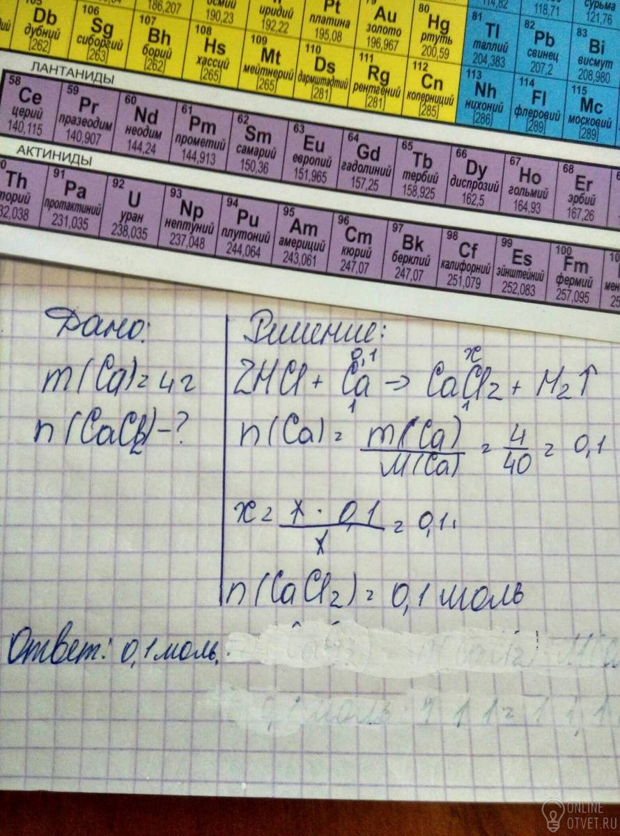 В реакцию с соляной кислотой вступило 4 г кальция. Рассчитайте количество (моль) образовавшейся соли.