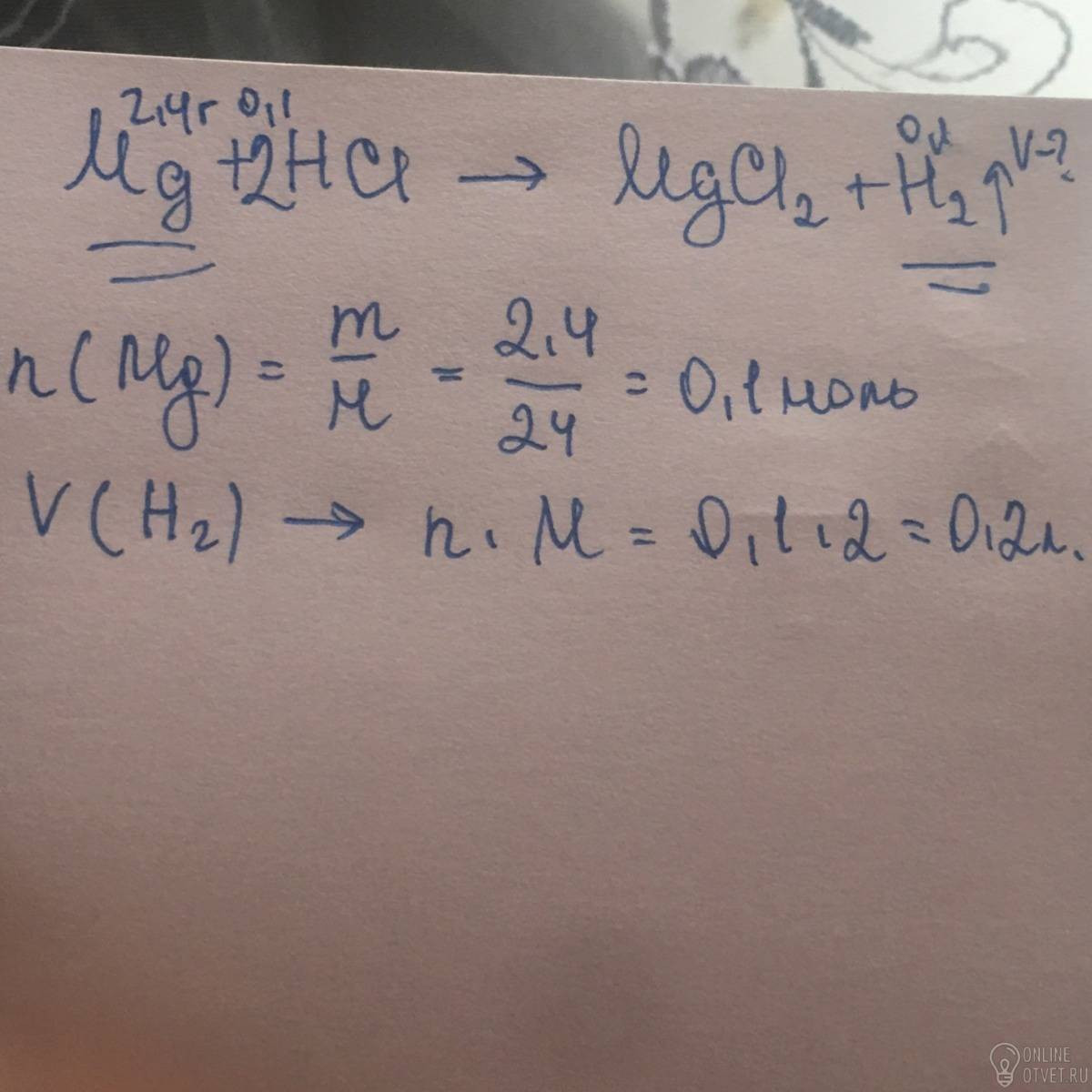 Объем (н.у) газообразного продукта реакции 2,4г магния с соляной кислотой равен