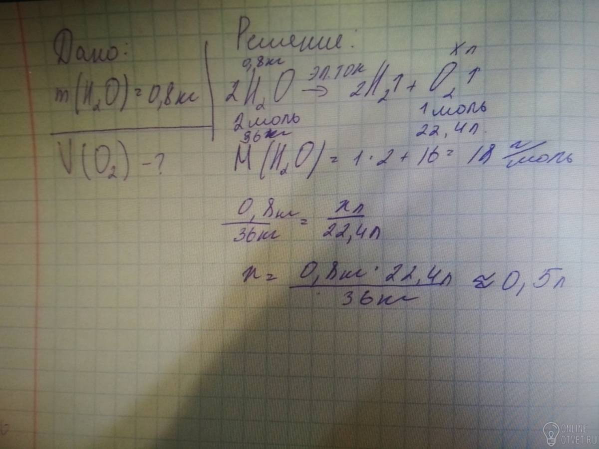 Вычислите, какая масса кислорода получится при разложении электрическим током воды массой 0,8 кг.