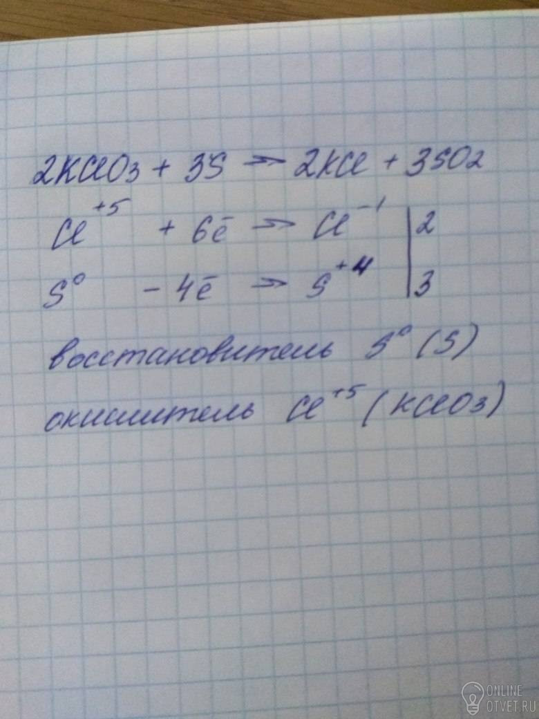 Подберите коэффициенты в уравнении окислительно-восстановительной реакции методом электронного баланса. Определите окислитель и восстановитель, процессы окисления и восстановления, сумму всех коэффициентов: KClO3 + S → KCl + SO2