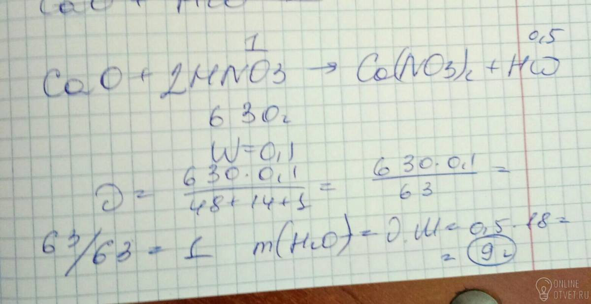 1) Найти массу воды, если вступили в реакцию оксид кальция и 630г 10% раствора азотной кислоты