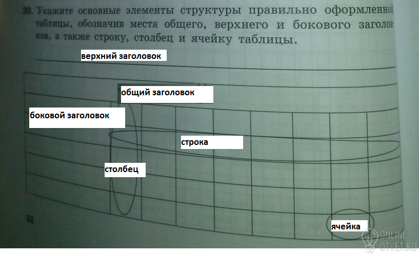 номер 30: Укажите основные элементы структуры правильно оформленный таблицы, обозначив места общего, верхнего и бокового заголовков, а также строку, столбец и ячейку таблицы.
