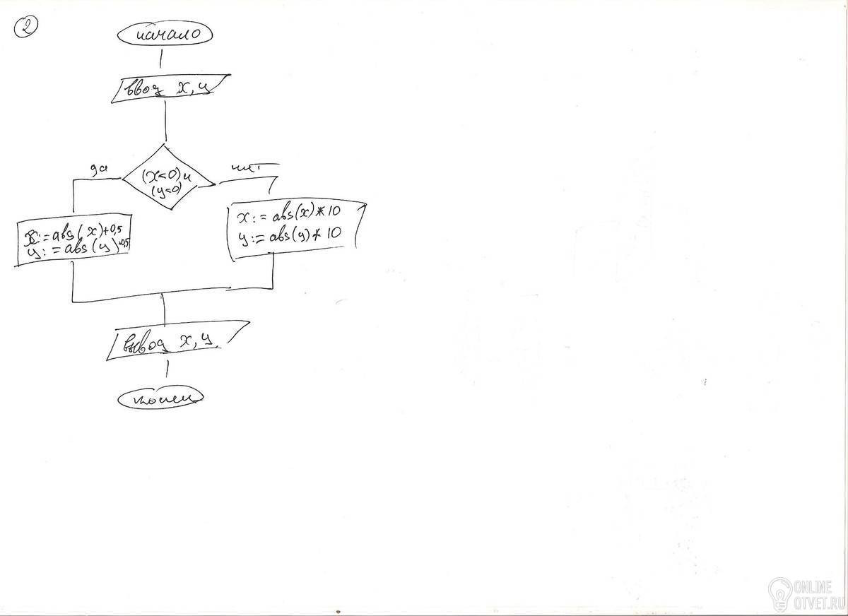 Тут идентичный алгоритм: вводим 2 переменные x, y, далее создаем условие и возводим в модуль... (скриншот 2 с блок-схемой)