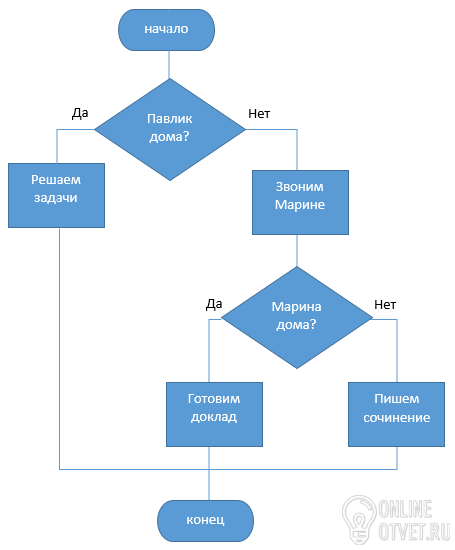 помогите нарисовать блок схему к АЛГОРИТМУ: Если Павлик дома, будем решать задачи по математике. В противном случае следует позвонить Марине и вместе готовить доклад по биологии. Если же Марины нет дома, то надо сесть за сочинение.
