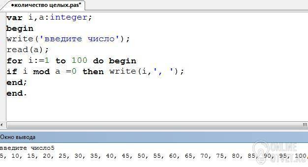 На паскале печатает на экране в строчку, через запятую все натуральные числа от 1 до 100, которые делятся на это число без остатка
