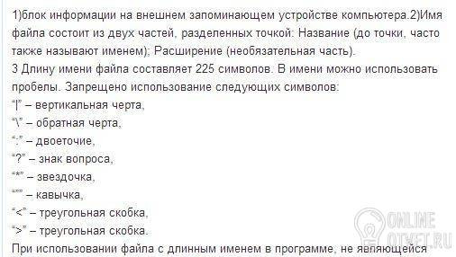 1.Что такое файл? 2.Из каких частей состоит имя файла? 3.Какие правила записи имени файла следует соблюдать? 4.Типы файлов