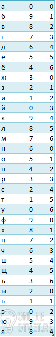 На каждой из трех осей установлено по одной вращающейся шестеренке и неподвижной стрелке. Шестеренки соединены последовательно. На первой шестеренке 33 зубца, на второй - 10, на третьей - 7.На каждом зубце первой шестеренки по часовой стрелке написано по одной букве русского языка в алфавитном порядке: А Б В Г Д Е Ё Ж З И Й К Л М Н О П Р С Т У Ф Х Ц Ч Ш Щ Ъ Ы Ь Э Ю Я На зубцах второй и третьей шестеренки в порядке возрастания по часовой стрелке написаны цифры от 0 до 9 и от 0 до 6 соответственно.Когда стрелка первой оси указывает на букву, стрелки двух других осей указывают на цифры. Буквы сообщения шифруются последовательно. Шифрование производится вращением первой шестеренки против часовой стрелки до первого попадания шифруемой буквы под стрелку. В этот момент последовательно выписываются цифры, на которые указывают вторая и третья стрелки. В начале шифрования стрелка 1-го колеса указывала на букву А, а стрелки 2-го и 3-го колес - на цифру 0. Следовательно, шифр буквы А - 0 0.Вам предстоит зашифровать слово - О Л И М П И А Д А.В ответе укажите через пробел 18 цифр - каждая пара соответствует коду буквы на второй и третей шестеренке соответственно.