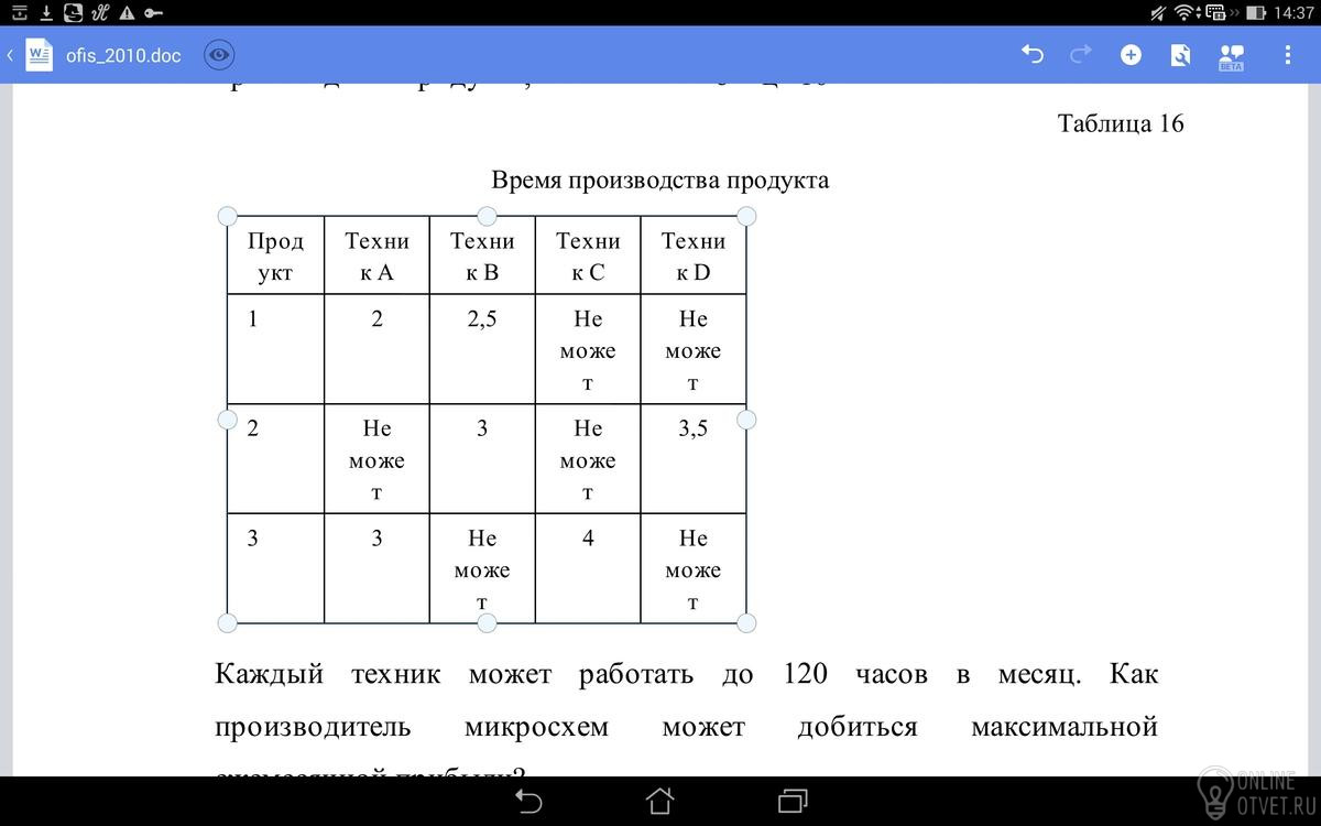 На фабрике по производству микросхем четыре техника (A, B, C и D) производят три продукта (продукты 1, 2 и 3). Производитель микросхем может продать в этом месяце 80 единиц продукта 1, 50 единиц продукта 2 и, самое большее, 50 единиц продукта 3. Техник A может производить только продукты 1 и 3. Техник B может производить только продукты 1 и 2. Техник C может производить только продукт 3. Техник D может производить только продукт 2. Каждая произведенная единица продукта дает следующую прибыль: продукт 1: 6 руб.; продукт 2: 7 руб.; продукт 3: 10 руб. Время (в часах), требуемое каждому из техников для производства продукта, показано в таблице 16