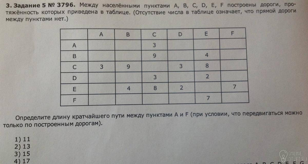 Между населенными пунктами A, B, C, D, E, F построены дороги, протяженность которых приведена в таблице. (Отсутствие числа в таблице означает, что прямой дороги между пунктами нет.)